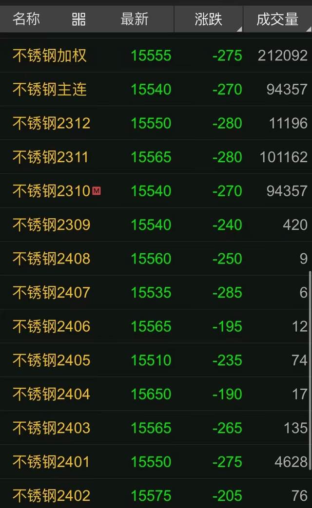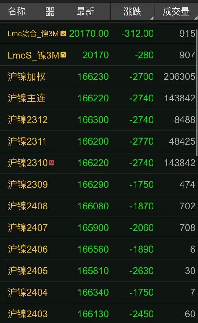 鎳價(jià)期貨方面:倫鎳當(dāng)前下跌300多美元;滬鎳始終保持最高2000多元的跌幅;不銹鋼期貨最高下跌200多元。